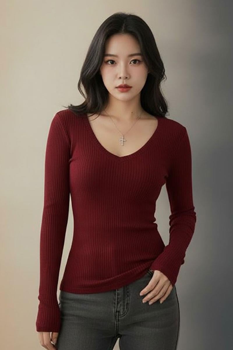 Bordo Geniş Yaka Düz Y2K Uzun Kollu Crop (KHFT849B)