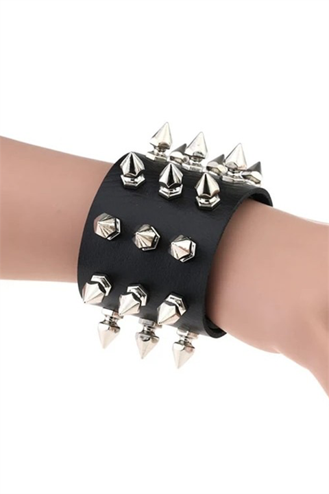 Siyah Gotik 3 Şerit Dikenli Detaylı Deri Bileklik (KBL187)